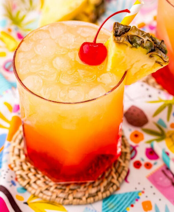 Coconut rum, pineapple juice, orange juice, and grenadine, garnished with a cherry and a slice of pineapple
