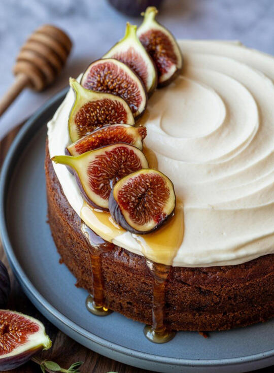 Decadent honey bourbon layer cake with salted honey butter frosting and layers of Old World Fig jam, topped with a generous honey drizzle, sparkling rosemary, and fresh figs.