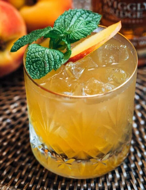 Diced peach and mint are muddled into a shaker with brown sugar simple syrup and bourbon, topped with a splash of ginger beer, garnished with fresh mint and peach slices