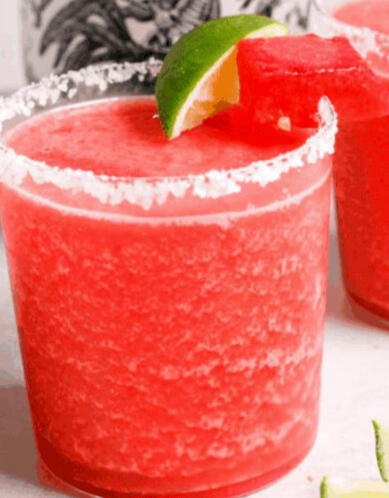 Tequila, triple sec, fresh lime juice, honey, frozen thundermelon, and ice, blended together, served with a salt or sugar rim