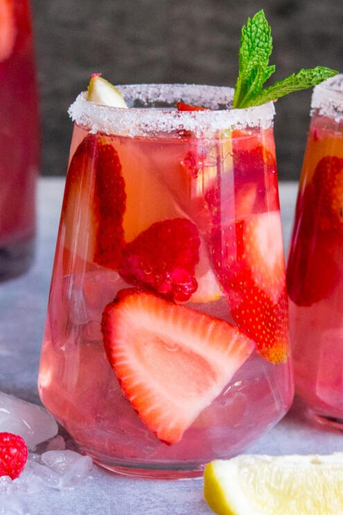 Vodka with muddled strawberries, lemonade, and lemon-lime soda, served with a sugar rim and garnished with mint