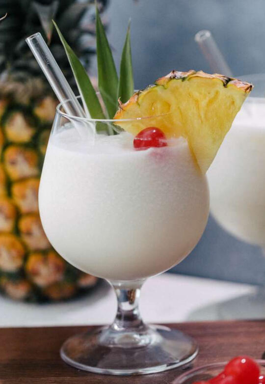 White rum, cream of coconut, coconut milk, pineapple juice, frozen pineapple chunks, lime, and ice blended together and garnished with pineapple slices and cherries