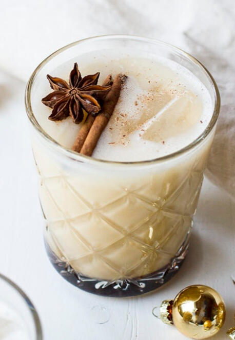 While we're wishing for snow this festive drink will definitely keep you nice and warm! Vodka, coffee liqueur, and eggnog, all topped off with nutmeg, star anise, and a cinnamon stick