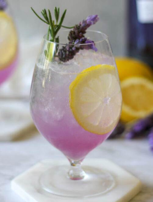 Empress gin mixed with simple syrup, lemon juice, and topped with sparkling water, garnished with lemon and sprig of lavender