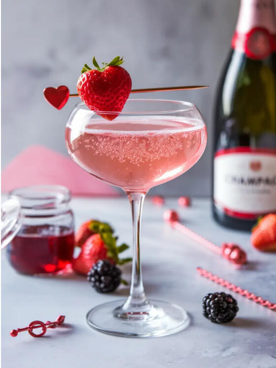 Berry syrup is topped with chilled champagne and served in a champagne coupe garnished with a heart shaped strawberry
