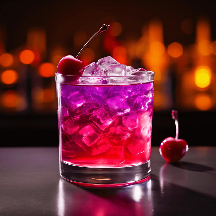 This drink brings a little sweet and a little tart for a cute cocktail that packs a punch! Pink whisky, lime juice, cherry syrup, and simple syrup are shaken together and served over ice with cherries for a dark pink drink that will have you saying love is in the air.