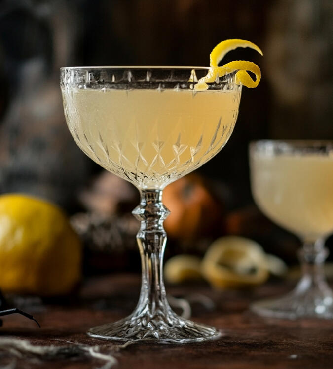 Gin, cointreau, lillet blanc, lemon juice, and absinthe are shaken and served in a chilled cocktail glass with a lemon twist for a strong drink that'll bring back the dead