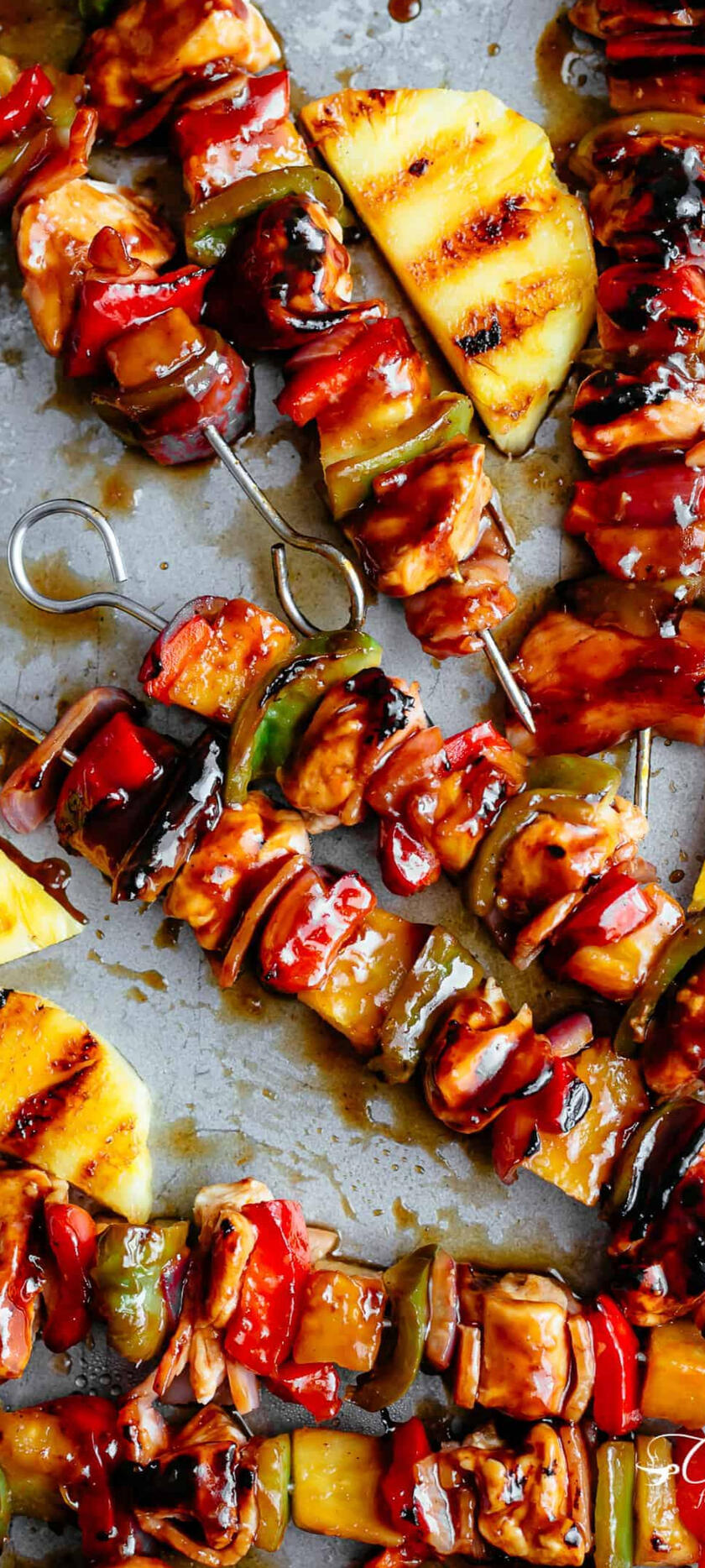 Skewers of chicken, pineapple, and bell peppers grilled to perfection and served with a side of sweet teriyaki sauce