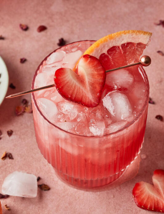 Vodka, grapefruit juice, hibiscus syrup, and strawberry puree are shaken then strained over crushed ice in a short glass, garnished with a strawberry heart and grapefruit