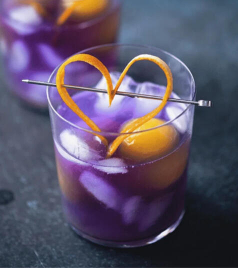 Purple pixie gin, lemon juice, and soda are poured overtop of ice cubes made of orange juice, stirred gently, and garnished with orange peels in the shape of a heart