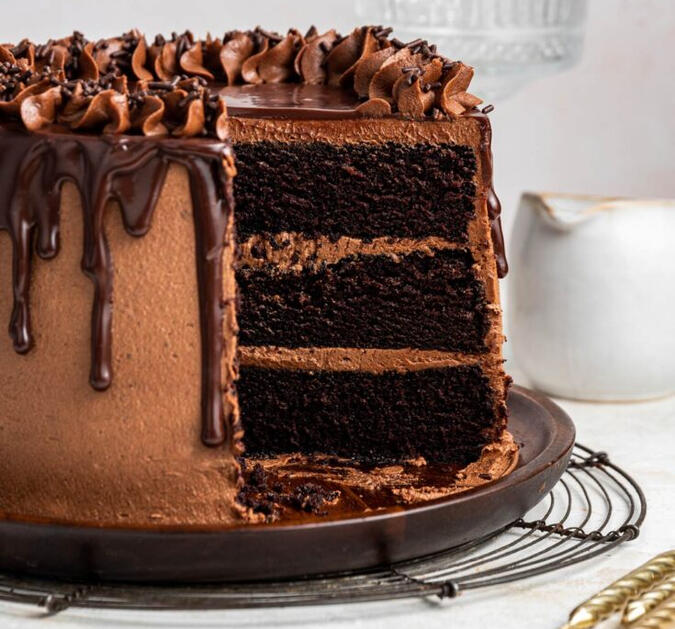 A decadent chocolate cake with covered in chocolate frosting, and topped with chocolate ganache and chocolate sprinkles