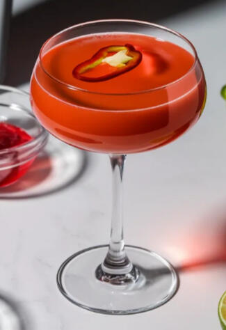 Smoky mezcal, fresh lime juice, cranberry juice, and serrano syrup are shaken with ice, and served in a cocktail glass garnished with a spicy little slice of pepper