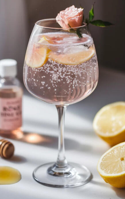 Vodka, rose water, lemon juice, a splash of pomegranate juice, and honey are shaken and strained into a wine glass, topped with sparkling water and garnished with a rose