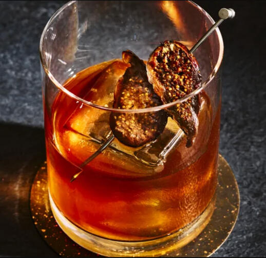Inspired by the tale of a Viera who couldn't help but help himself to something sweet. Bourbon, caramelized fig syrup, and bitters are stirred with ice in a mixing glass, strained over ice, and garnished with a candied fig.