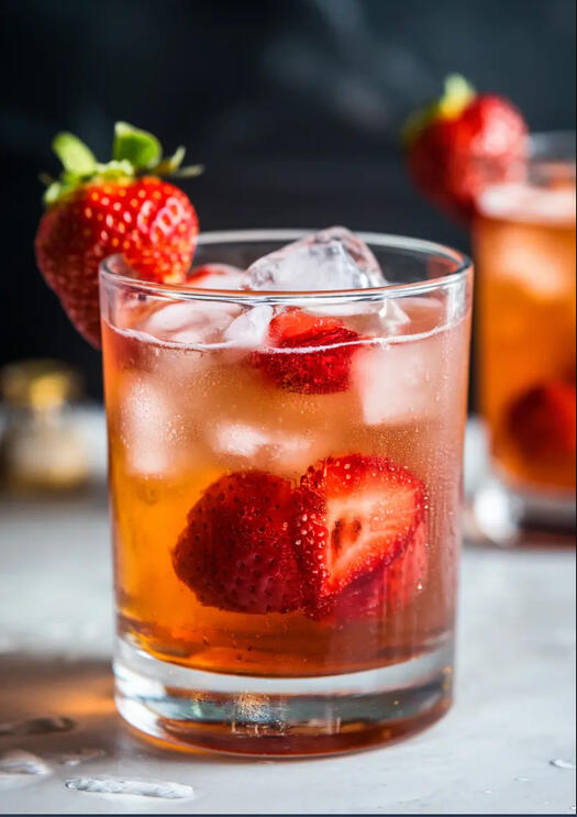 Strawberries, lemon juice, and maple syrup are muddled in a short glass, topped with bourbon, ice, and club soda, gently stirred, and garnished with a strawberry