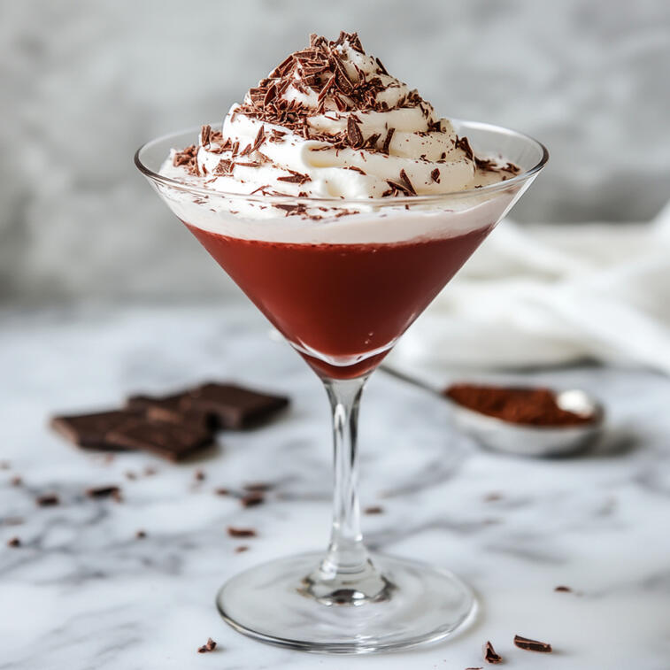 Vodka, red velvet liqueur, and chocolate syrup are shaken with ice, strained into a martini glass, and topped with whipped cream and chocolate shavings