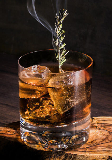 We smoke out a whisky glass with a sprig of rosemary, torched and left to smolder while we make the cocktail. Whisky, birch bark syrup, Angostura bitters, and orange bitters are mixed together, strained over a large cube of ice, and served with an orange peel twist and the smoked rosemary.