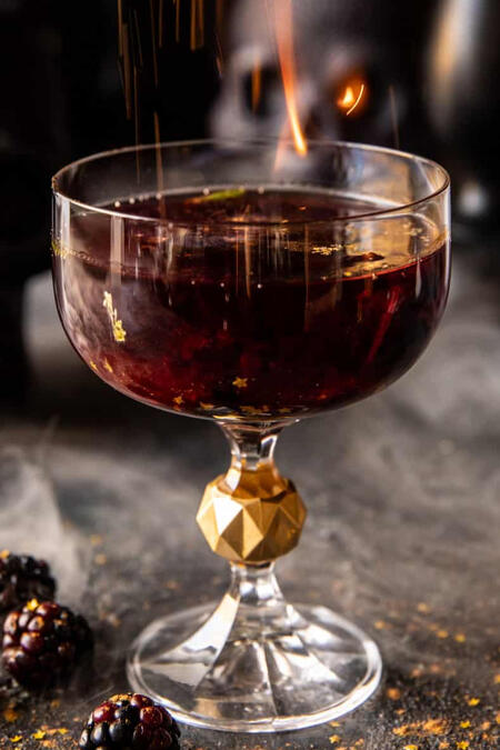 Vodka, blue curacao, cranberry juice, sweet and sour mix, and grenadine are shaken together for one spooky and vibrant drink