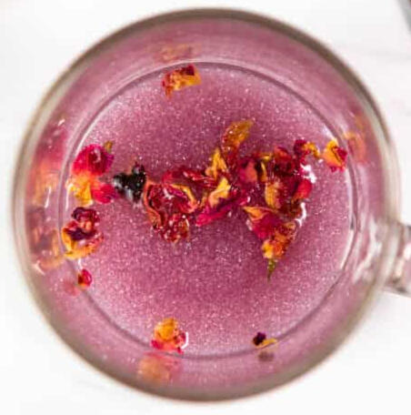 Vodka, rose water, lemon juice, a splash of pomegranate juice, and honey are shaken and strained into a wine glass, topped with sparkling water and garnished with a rose