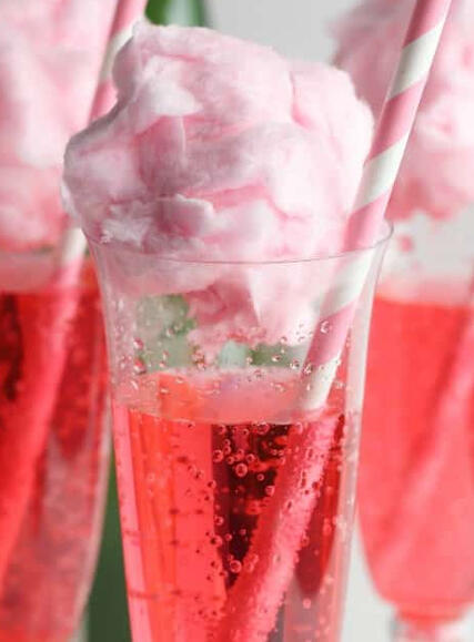 Berry syrup is topped with chilled champagne and served in a champagne coupe garnished with a heart shaped strawberry